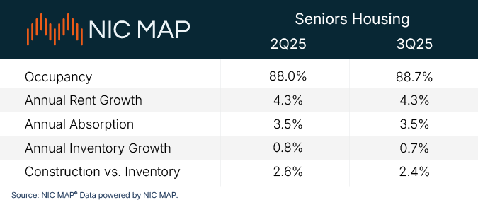 • Assisted living occupancy jumped to 87.2%, an increase of 0.9 percentage points from 2Q25. This housing serves older adults who need assistance with common daily activities.