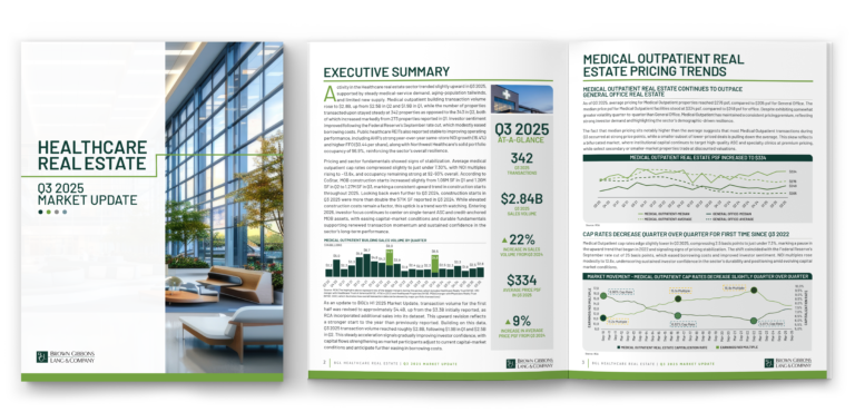 BGL’s Healthcare Real Estate Market Update highlights activity and industry trends in the medical outpatient real estate sector, particularly by featuring the most active players in Q3, and provides year-to-date transaction activity and in-place metrics by region. BGL remains committed to informing clients of the current state of the healthcare real estate market and is always available to discuss appropriate strategies and financial alternatives with its clients and prospects.